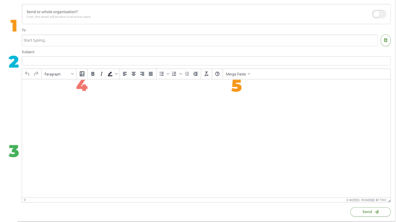 - Select who you wish to email. The ‘Sending to whole organisation’ toggle will select all current users of the platform. If you want to email certain users or groups, you can search directly in the ‘To’ field or through the contact book icon on the right.