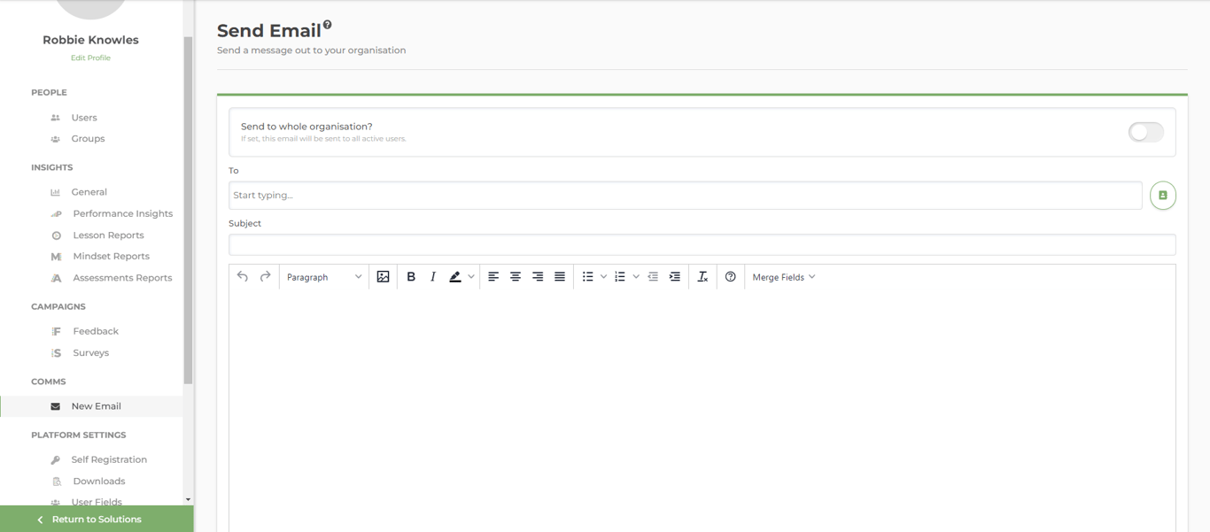 - Insert merge fields as desired. Merge fields allow you to personalise the email by generating the recipients/system information upon sending i.e. First Name, Last Name, Email address. There is also handy Platform URL, Email, and Password fields so you can quickly remind users where to go to access the platform and their log on details.