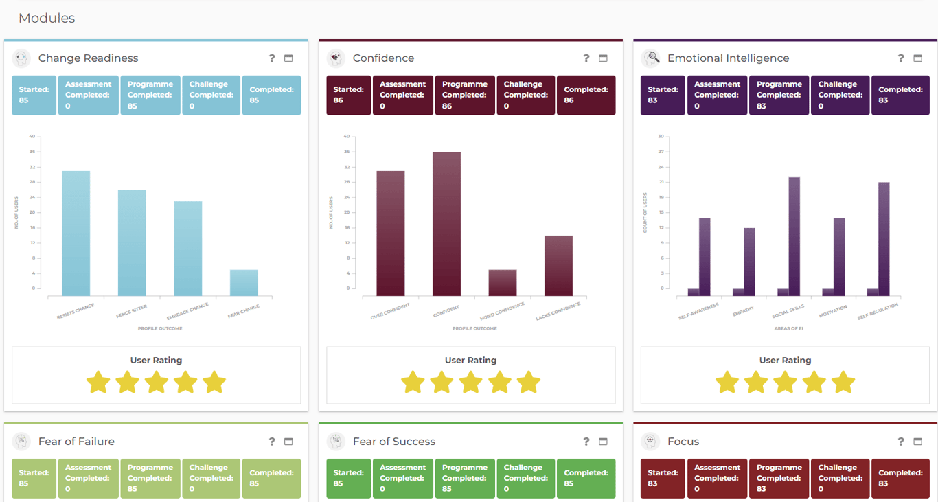 Mindset insights do not show any individual responses, but it will roll up your users' module ‘outcomes’ to give an overview of their Mindsets – i.e. 50/55 users are showing as having Imposter Syndrome.