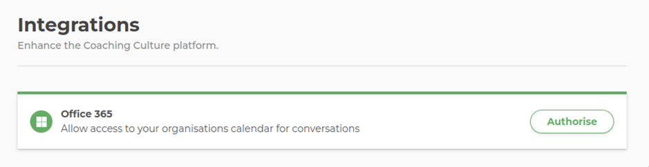 The integration can only be enabled by a user with Organisation Admin privileges within the Coaching Culture Platform and who is also an Administrator of the Office 365 account.