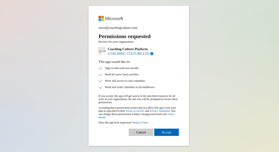 To provide a seamless experience, an administrator of your Office 365 account will need to authorise the integration. This means that the Coaching Culture Platform has read/write access to the calendars of all individuals within your organisation. This is programmatic access that is not able to be utilised by any individual at Coaching Culture. Additionally, the Platform only modifies events directly created by it.