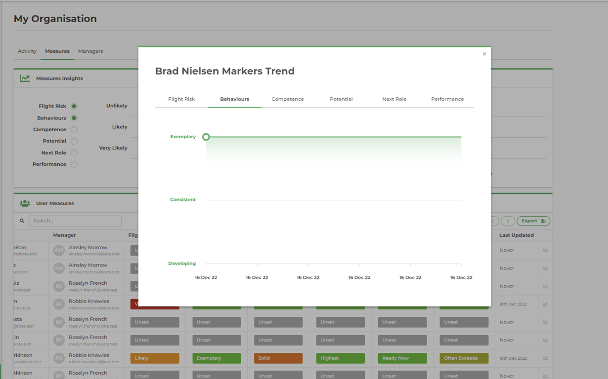- See the trends over time by clicking on the chart Icon and using the tabs to see the change in Measures over time