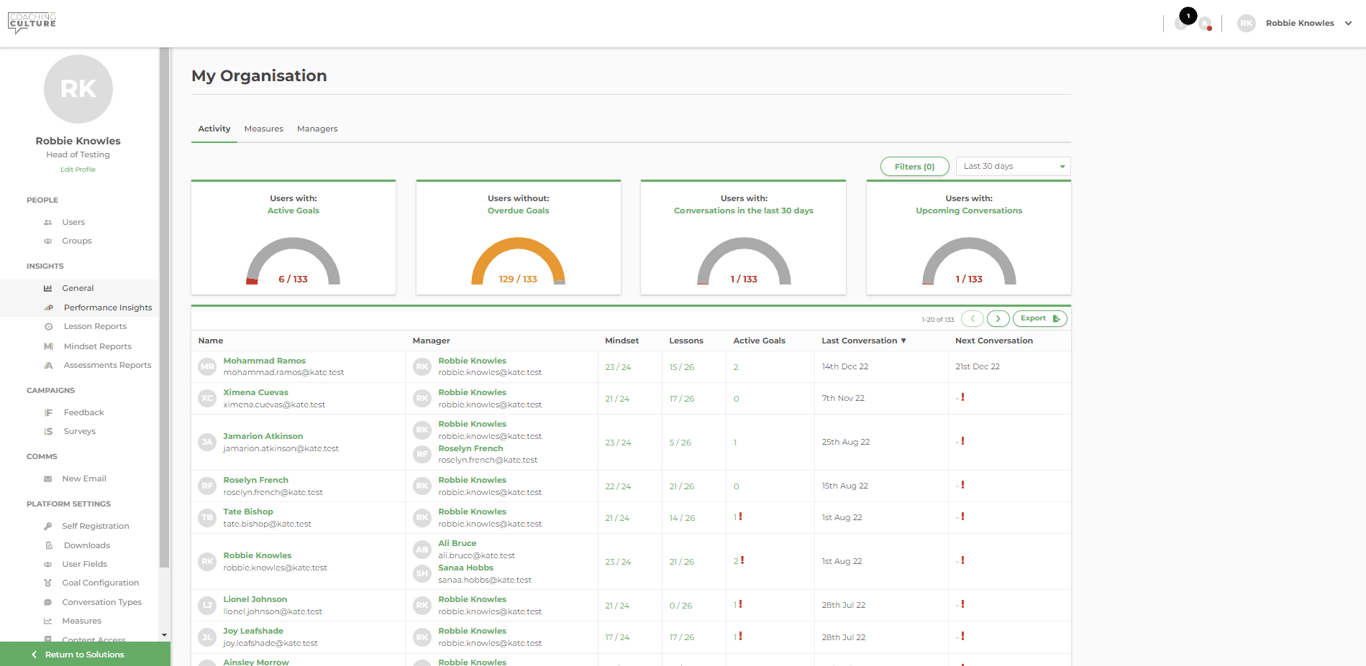 The activity table is designed to show you the activity for all of your users so that you can see if goals are being set and conversations are happening. The gauges at the top give you an idea of the status of your organisation as a whole. You will be able to see: