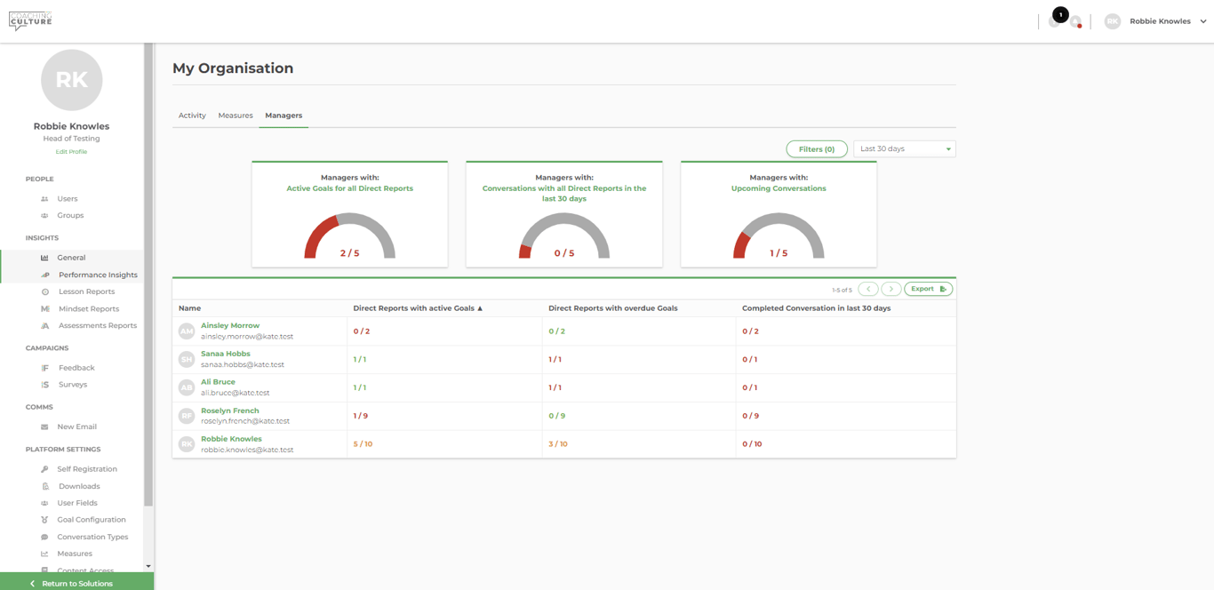 On this tab, you will get an overview of all of the managers and an idea of how many of their direct reports have active goals, have overdue goals and have completed conversations in the last x days (there is a filter for you to select the days)