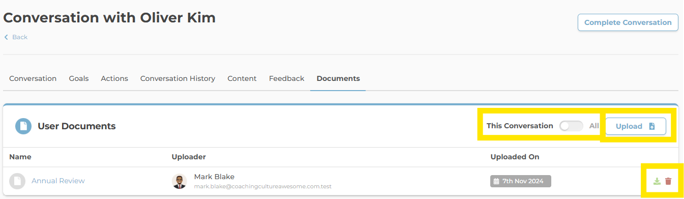 - You will now see a section displaying all documents attached to this user. This includes any documents that were uploaded during a conversation too.