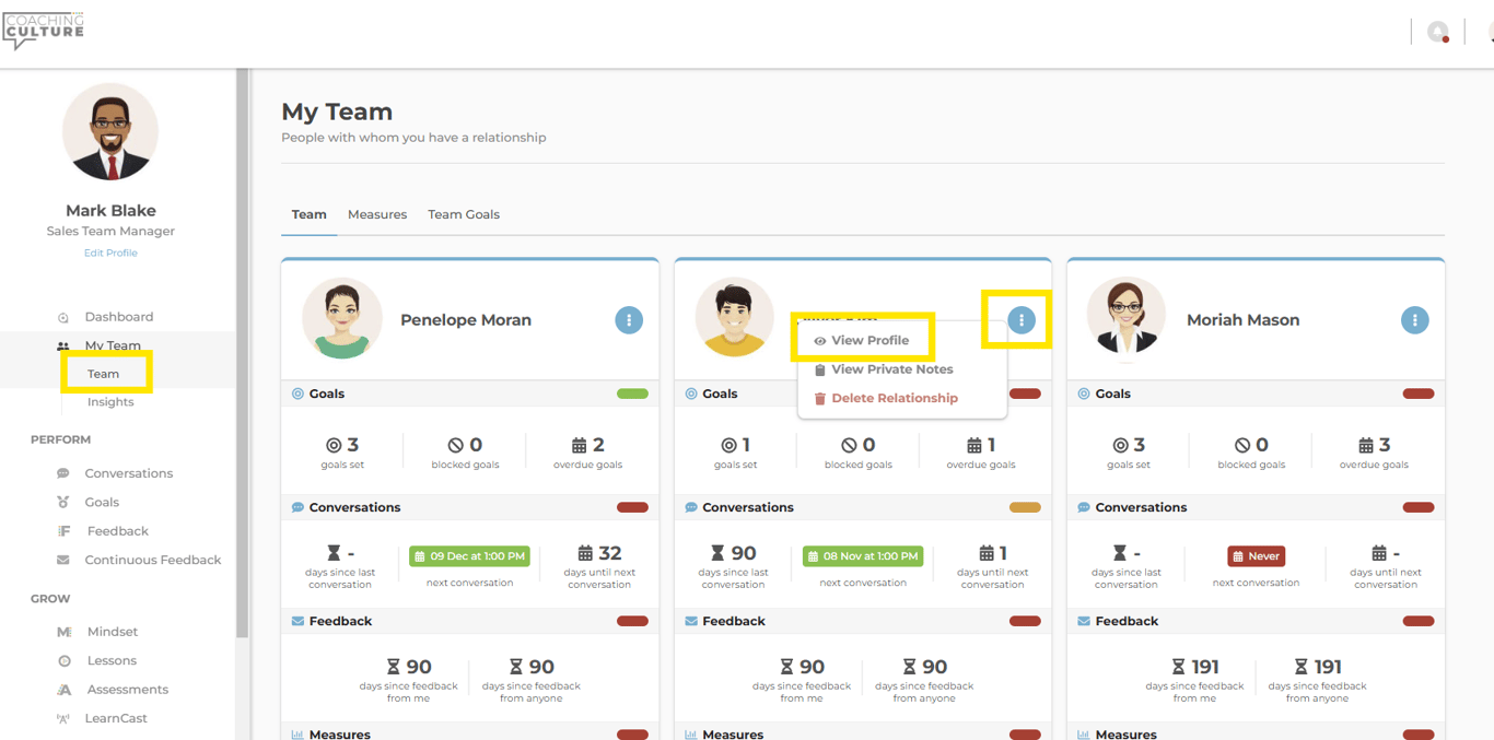 - From the left-hand menu select 'My Team' -> Click the three dots on the desired direct report -> View profile.