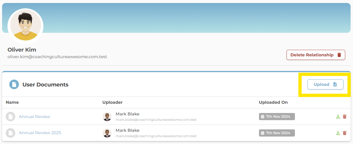 - Here you will see all your documents that have previously been added, including the date they were added and which user uploaded it.