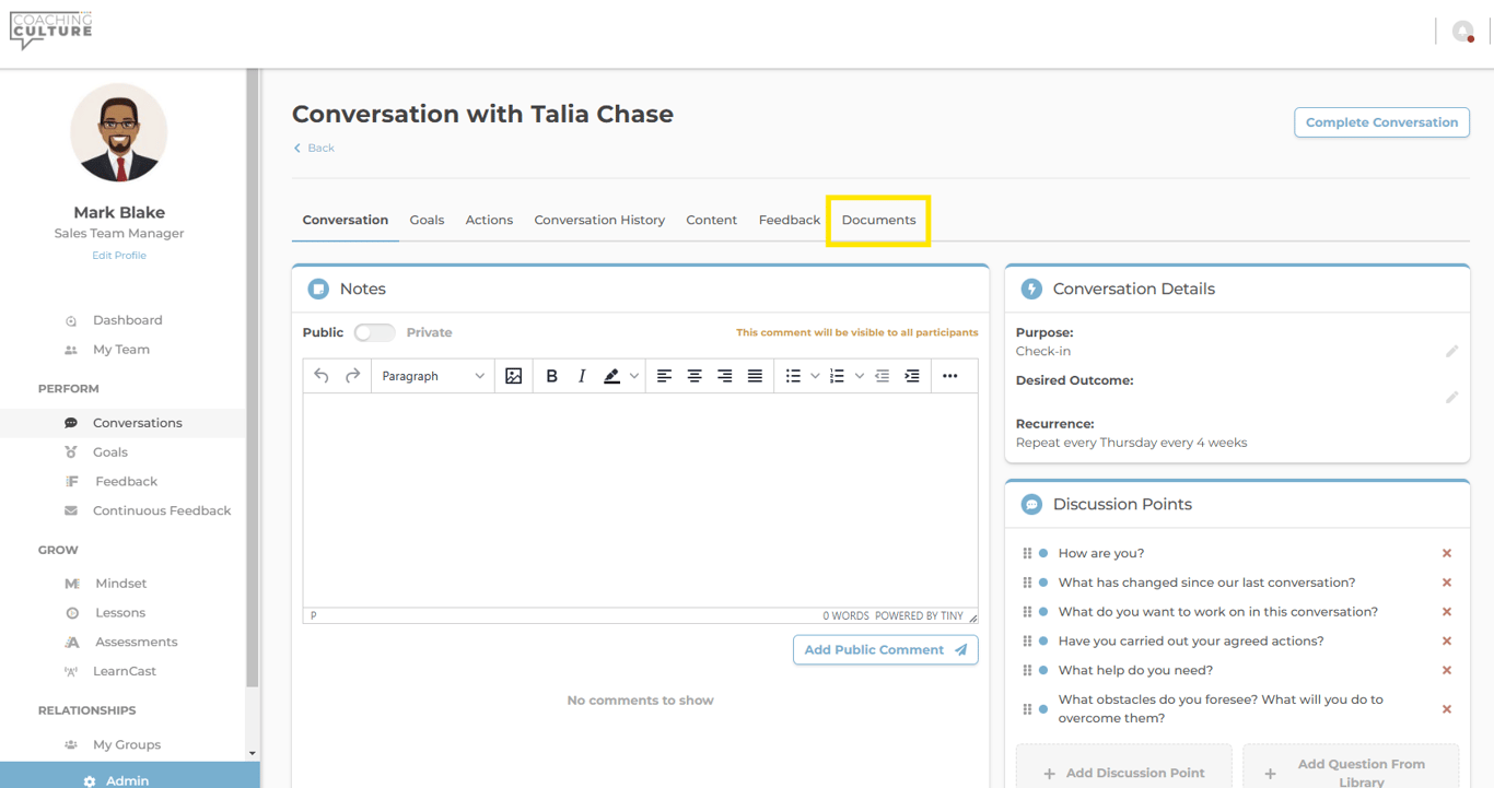 - Whilst in a conversation, simply select the 'documents' tab as shown below