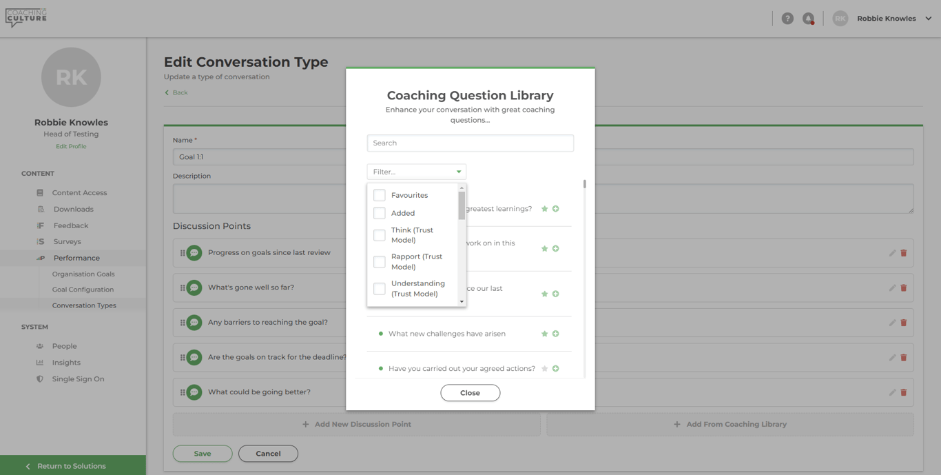 - Discussion points can be added manually or you can add them from the Coaching Library, where you will find over 200 coaching questions.