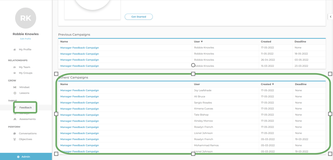 If you have been given permission to see your team's feedback when the campaign is set up, you can find it by navigating to "Feedback" and then scrolling down to see "Others' Campaigns".