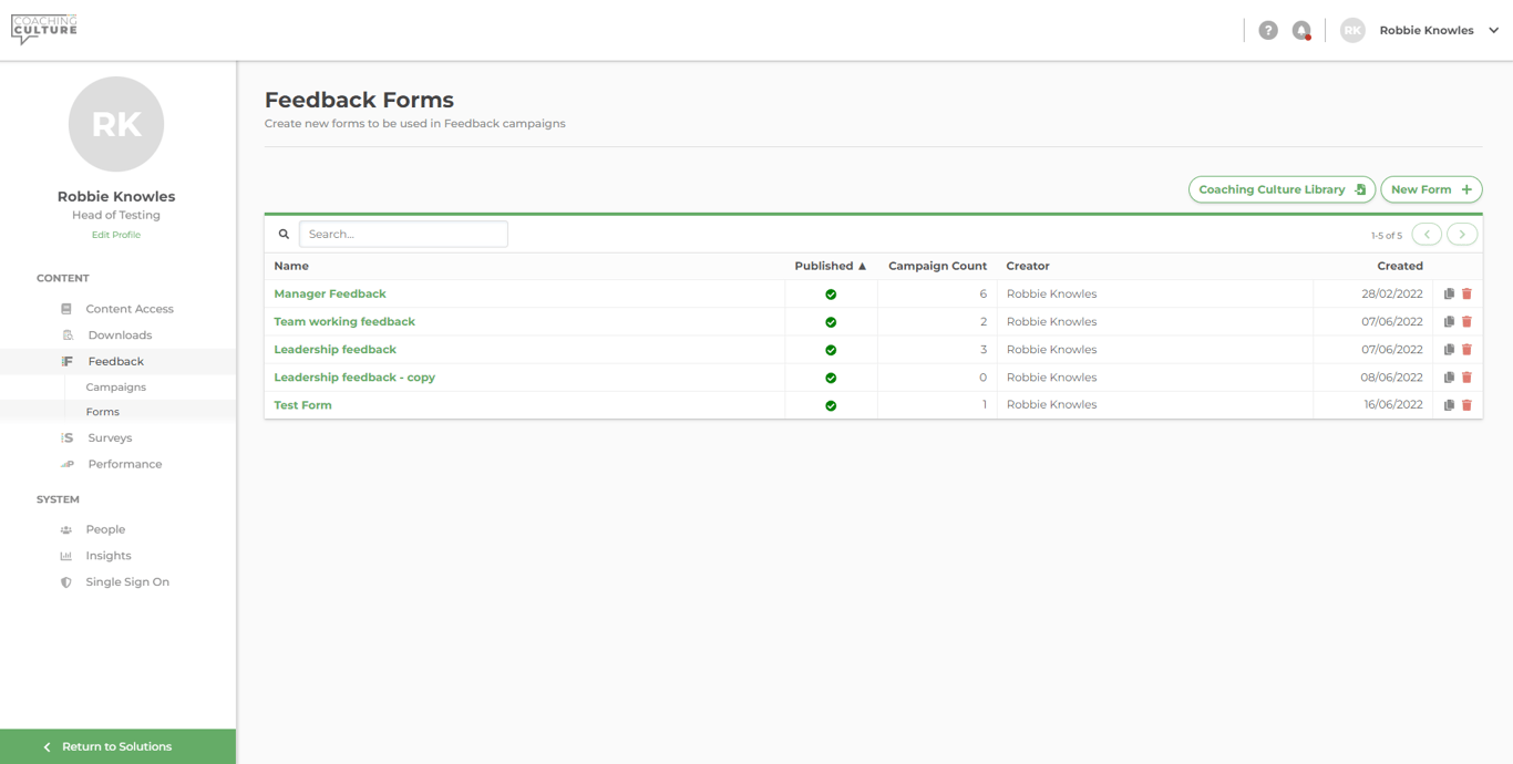 To create a feedback form, navigate to Admin > Feedback > Forms and press