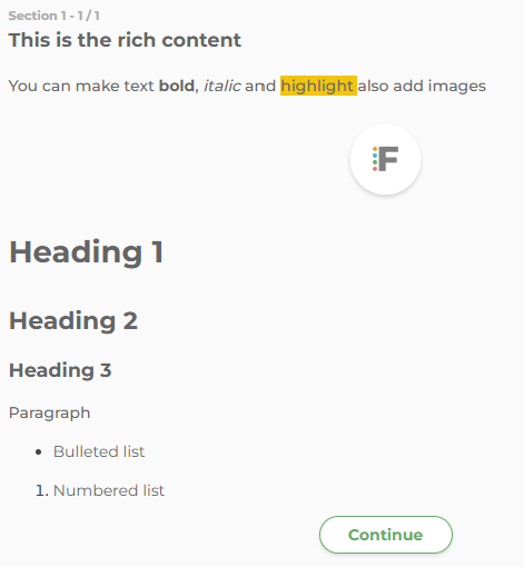 Rich Content - This is perfect to use at the start and end of the feedback form for introductions, to give context and to provide helpful hints to the user who is about to respond to the questions.